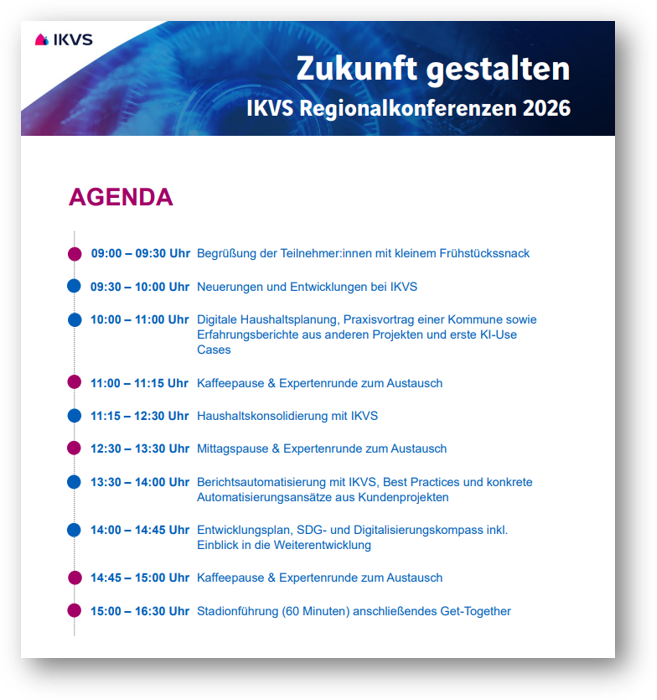 Seien Sie gespannt auf Einblicke in vielfältige IKVS‑Kundenprojekte – von Planung und Prognose bis Berichtswesen und Haushaltskonsolidierung – sowie einen Ausblick auf die zukünftige Entwicklung der IKVS‑Plattform.